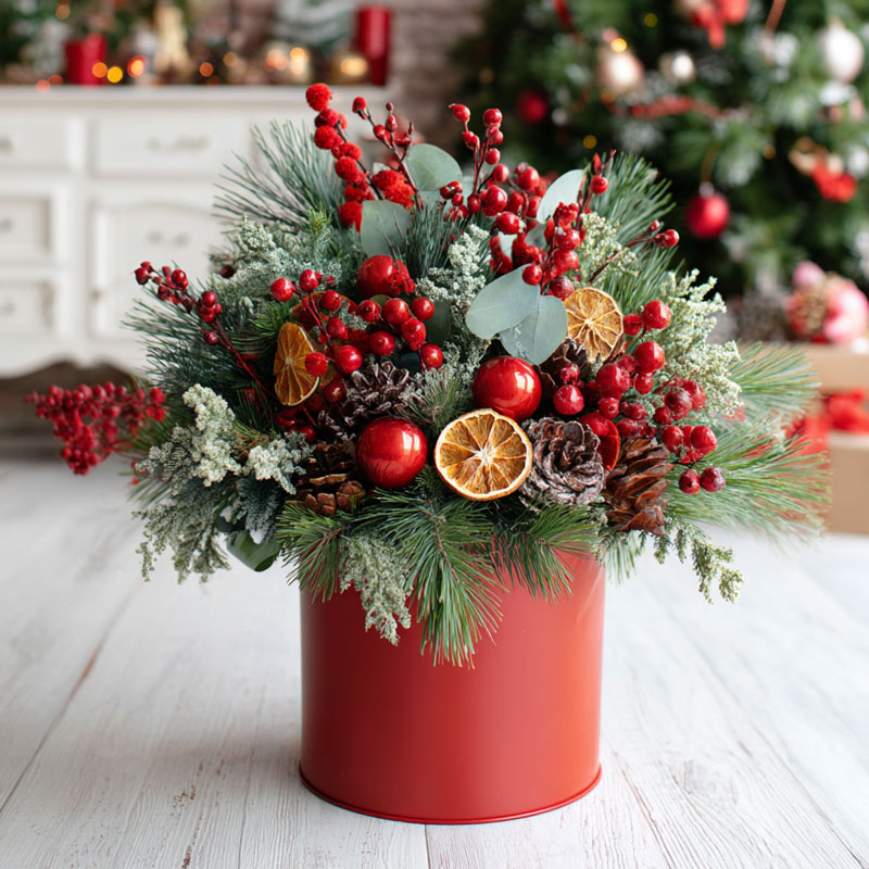 his lush, eye-catching Christmas floral arrangement is a perfect blend of festive tradition and cozy elegance. Nestled in a sleek red metal container, it features fresh evergreen pine sprigs, frosted silver foliage, and vibrant clusters of red berries (holly/hypericum), complemented by natural pinecones and dried orange slices for a warm, seasonal touch. Shiny red baubles add a playful, festive glint, while soft eucalyptus leaves balance the richness with subtle texture. Ideal as a table centerpiece, mantel decor, or thoughtful holiday gift, this arrangement brings the cozy spirit of Christmas to any Singaporean home—no maintenance needed (long-lasting for the entire festive season)!